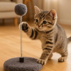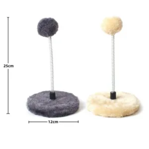 Giocattolo interattivo Bouncy Cloud con molla metallica elastica e pompon soffice. Base peluche morbida ø12cm, altezza 25cm. Movimento oscillante imprevedibile stimola istinto predatorio e favorisce esercizio fisico. Colori assortiti: grigio o beige.