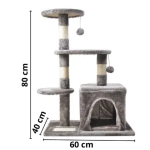 Tiragraffi tower Diamond Peak 80cm con 4 livelli e cuccia coperta integrata. Pali in sisal grigio/beige, piattaforme in peluche morbido. Base 60x40cm stabile. Include 2 palline giocattolo. Ideale per gatti grandi o più gatti. Design elegante grigio scuro.