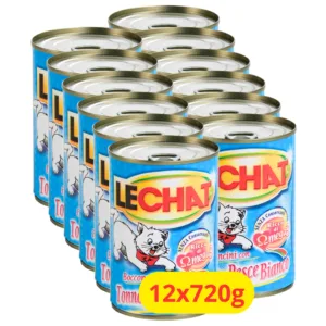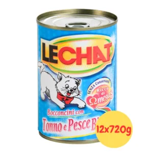 Cibo completo LeChat con tonno e pesce bianco naturalmente ricchi di Omega-3 per pelo lucido e benessere cardiovascolare. La ricetta con pesci selezionati al 20% è arricchita con vitamine A-D3-E senza coloranti né conservanti. Il multipack 12x720g offre convenienza e qualità Made in Italy.