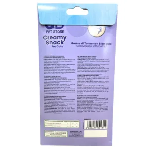 Snack Cremoso al Tonno con Catnip è una mousse complementare per gatti con tonno al 28%, catnip all’1%, taurina e FOS prebiotici. Stimola l’appetito e i sensi del gatto con una combinazione unica di gusto marino e erba gatti. Disponibile in formato da 20 e 40 stick.