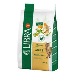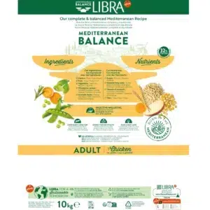 Crocchette Complete Libra Mediterranean Balance con pollo al 32% di proteine per gatti adulti. La ricetta mediterranea con verdure, frutta, cereali integrali ed erbe aromatiche favorisce benessere digestivo. Senza aromi, conservanti e coloranti artificiali. Il formato da 10kg offre convenienza e risparmio.