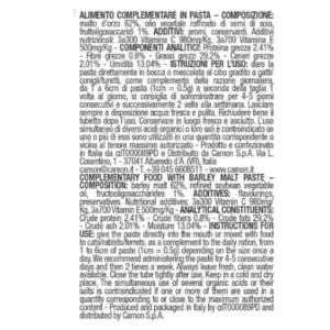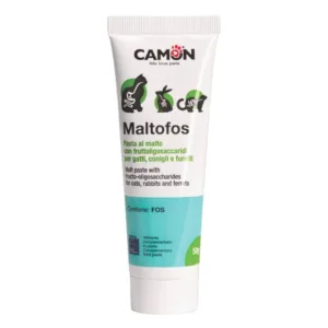 Camon Maltofos è una pasta al malto complementare per gatti, conigli e furetti con malto d’orzo al 62% e FOS prebiotici. Favorisce l’eliminazione dei boli di pelo e supporta la digestione. Con Vitamina C e E, Made in Italy — 50g.