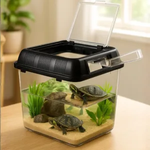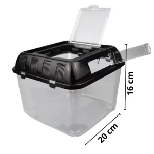 Vasca per tartarughe acquatiche e pesci 20×16cm con coperchio ventilato e manico. Doppia apertura superiore e sportello laterale. Struttura trasparente, clip sicurezza. Realizzato in plastica resistente e atossica