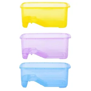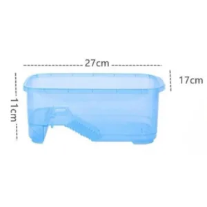 Vasca tartarughe 27×17×11cm con rampa integrata gradini antiscivolo e zona emersa. Palmetta decorativa, doppio habitat acquatico e asciutto. Tre colori trasparenti assortiti. Ideale tartarughe piccole e medie. Plastica resistente atossica. Facile pulizia.