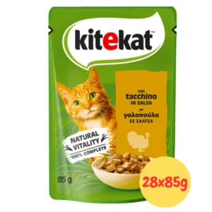 Bocconcini Kitekat al tacchino in salsa per gatti adulti con formula Natural Vitality. Le buste monodose da 85g garantiscono freschezza ottimale e porzioni calibrate mentre la carne magra di tacchino favorisce forma fisica ideale. Il multipack da 28 buste offre scorta pratica per una settimana.