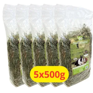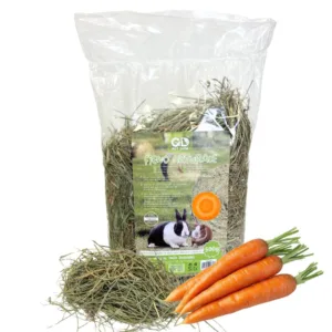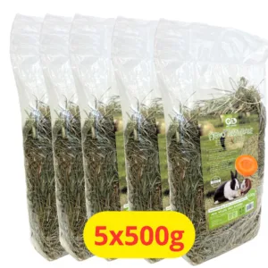 Fieno naturale 100% di prato per conigli e cavie, arricchito con carota disidratata ricca di betacarotene per vista e pelo sani. Steli lunghi integri che mantengono vitamine e minerali. Essenziale per digestione e denti sani. Confezione 5x500g formato multipack da 2,5kg totali. Colore verde intenso, aroma fragrante. Senza additivi chimici, qualità premium.