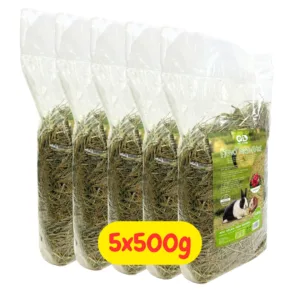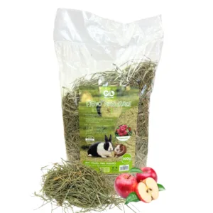 Fieno naturale 100% di prato per conigli e cavie, arricchito con mela disidratata. Steli lunghi integri che mantengono vitamine e minerali. Essenziale per digestione sana e consumo denti. Confezione 5x500g formato multipack da 2,5kg totali. Colore verde intenso, aroma fragrante. Senza additivi chimici, qualità premium naturale.