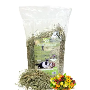 Fieno naturale 100% di prato per conigli e cavie, arricchito con multifiori spontanei commestibili colorati. Steli lunghi integri con petali gialli, rossi, arancioni e viola per varietà botanica. Essenziale per digestione e denti, stimola interesse e comportamento esplorativo naturale. Confezione 5x500g da 2,5kg totali. Senza additivi chimici, fieno gourmet premium.