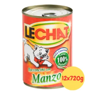 Alimento completo LeChat con bocconcini al manzo e carne bovina al 16% per gatti adulti che amano il gusto robusto della carne rossa. La ricetta proteica arricchita con vitamine A-D3-E è formulata senza coloranti né conservanti. Il multipack 12x720g garantisce praticità e risparmio.
