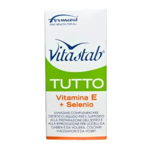 Mangime complementare Formevet Vitastab con Vitamina E e Selenio per supportare la preparazione all’estro e la riproduzione negli uccelli da gabbia, voliera e colombi. La formula liquida con antiossidanti favorisce fertilità, spermiogenesi e sviluppo embrionale. Formato pratico da 100ml con dosatore.