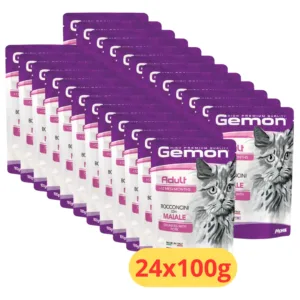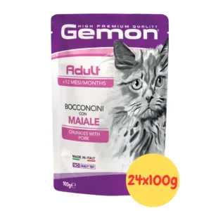 Gemon Adult Bocconcini con Maiale, alimento completo High Premium Quality Made in Italy con maiale fresco (16%), taurina e vitamine per gatti adulti. No Cruelty Test. Senza coloranti artificiali.
